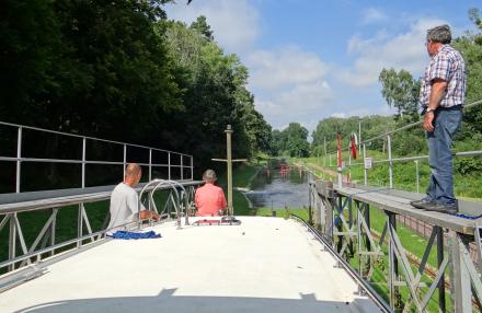 The crew stand by to take back control of the boat as the cradle base will shortly submerge.