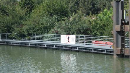 This is at the end of the row of mooring pilings (dolphins / Ducs d'Albe) close to the lock. Not easily seen from a distance.