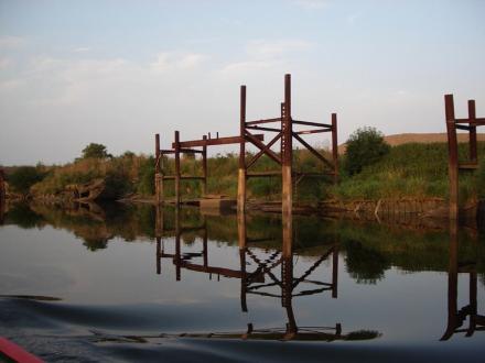 The rusting remains of sunken barges hold up the bank.