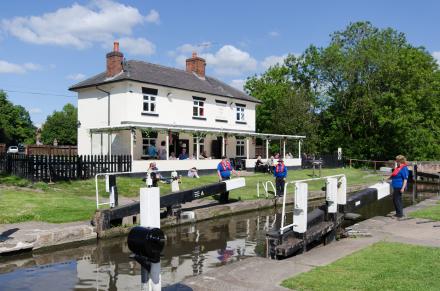 The lock here is an incredibly popular location for gongoozlers (people watching the boats go by) situated as it is next to both a pub (The Stenson Bubble) and the coffee shop that now occupies the former keeper's cottage seen here.