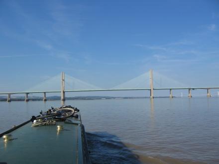 The picture is taken from the south, cruising up the estuary. The Severn Bridge is visible between the towers of the Second Severn Crossing.