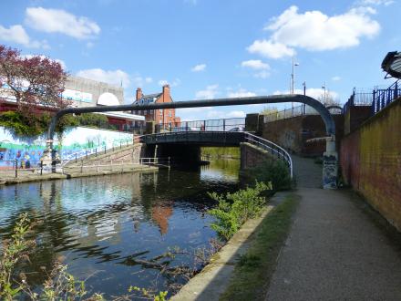 Stanley Road Pipe Bridge, Stanley Road Footbridge, No. 2 and Stanley Road Bridge, No. 2A. The footbridge is a changeline bridge with access to the towpath from Stanley Road.