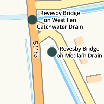 B1183 Revesby Bridge. Hagnaby Lock (no gates). Thorpe Drain. Bell Water Drain. Fodder Dyke. West Fen Catchwater Drain. A16 Bar Bridge. Medlam Drain.