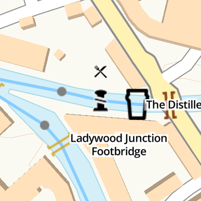 Travel to Smethwick Junction, then on the Birmingham Canal Navigations (Old Main Line) to Tipton Junction, then on the Birmingham Canal Navigations (Dudley Canal No 1 - Birmingham End) to Dudley Canal & Tunnel Trust Footbridge