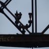 A view of the iron work railing detail of the Medford Pipe Bridge, looking towards the site of the original Cradock Bridge over the Mystic River. The Medford Pipe Bridge is a historic plate girder pipeline bridge over the Mystic River, ...
