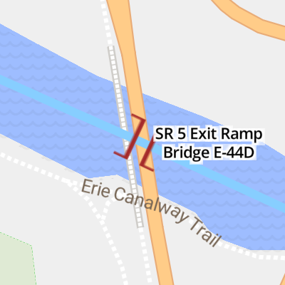 Bridge Heights - New York State Canals101.80, Bridge E-44D, SR 5 exit ramp, 404.00, 23.10, 406.00, 21.10, E20 lower. 102.44, Bridge E-46, railroad, MHWA [ADCX], 404.00, 22.17, 406.00, 20.17, E20 lower. 104.40, Bridge E-47A, Mohawk St, CR 30, 404.00, 22.30, 406.00, 20.30, E20 lower. 104.62, Bridge E-47B, NYS Thruway, I-90, 404.00, 22.24, 406.00, 20.24Â ...
