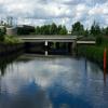 Carry boat beside road to re-enter river above road bridge with yellow handrail. You cannot ... Prairie Lea Bridge #1 ... It is the halfway point to Swinging Bridge.